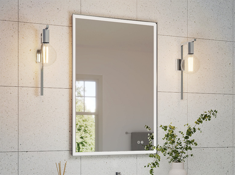 Built for vertical or horizontal mounting* and hardwired installation, it features a 5mm copper-free mirror, safety backing, and is available in multiple sizes — all backed by a 5-year limited warranty.