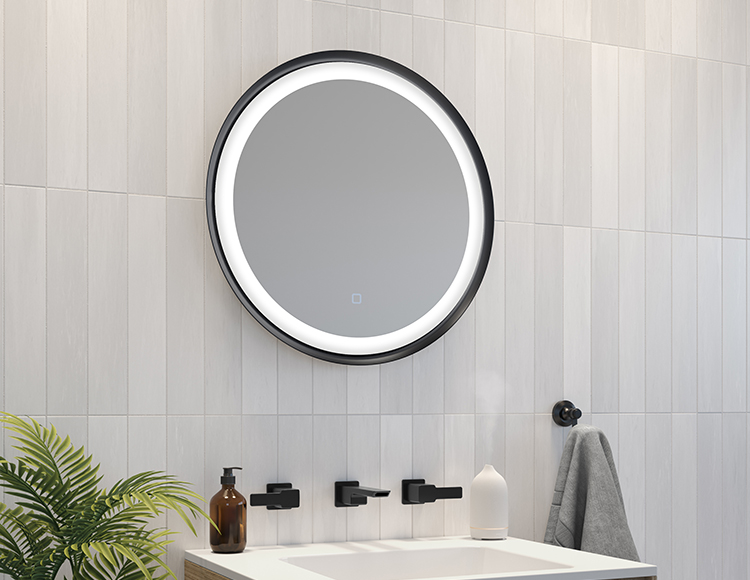 Framed in bold Matte Black, this mirror delivers warm white LED lighting ideal for grooming and makeup routines. Featuring a copper-free, distortion-free mirror, integrated defogger, and touch controls with built-in dimmer, it brings high-end function to your daily rituals.